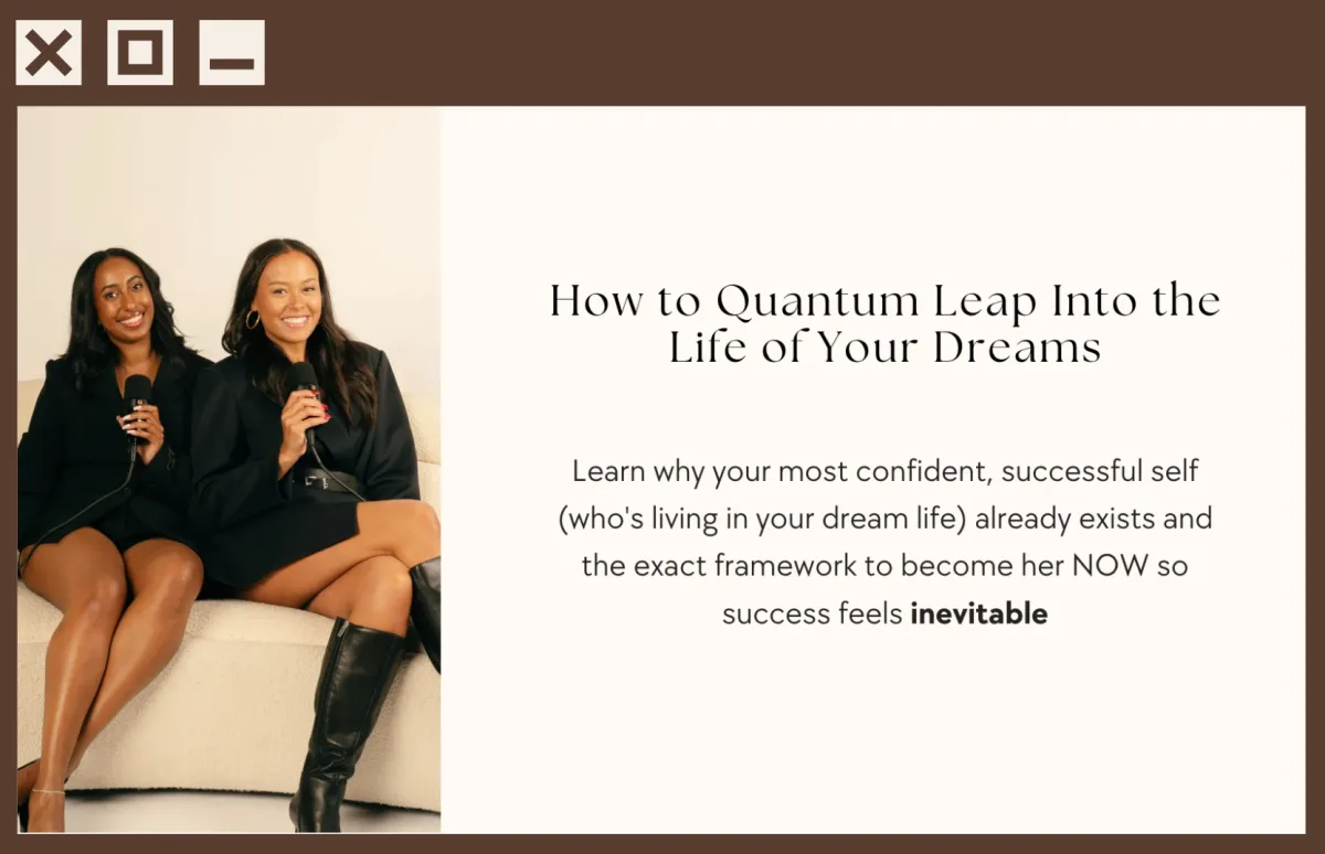 This is for you if you're ready to step into your dream life — whether that's building a successful business, finally breaking through your income ceiling, attracting the love you desire, or just becoming the most confident, magnetic version of yourself. This works whether you're an entrepreneur, corporate girlie, stay-at-home mom, or anywhere in between. The only requirement? You're done staying stuck and you're ready to do the inner work to become HER.